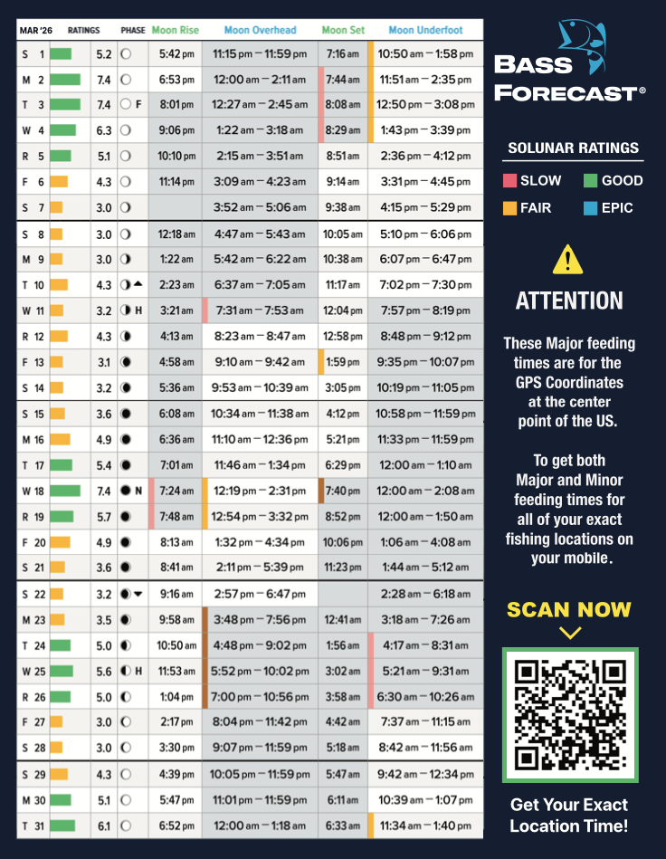 To assist anglers when it comes to planning fishing trips, we supply astro tables each month on Bassmaster.com. Lunar periods are enhanced when they overlap a key solar period. The best of these overlaps are designated by the sun symbols below. Enjoy our fishing calendars and discover the best fishing times each month. Tables provided by BassForecast.com.