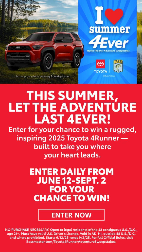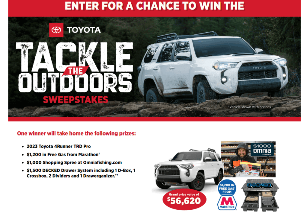 Enter daily through December 15 for a chance to win a 2023 Toyota 4Runner TRD Pro, $1,200 in Free Gas from Marathon, a $1,000 Shopping Spree at OmniaFishing.com, and a $1,500 DECKED Drawer System! Winner Stephen Lane of Kansas City, Mo.