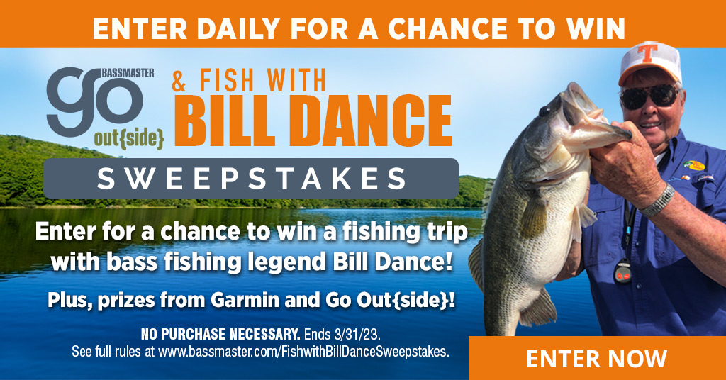 Enter daily through March 31 for a chance to win a fishing trip with TV host and bass fishing legend Bill Dance on one of his signature lakes! Plus, prizes from Garmin and Go Out! A total prize value of $6,205! - Winner S. Vance. of Columbus, Ohio.